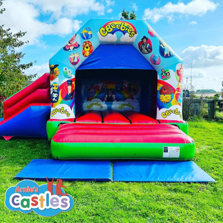 Arnie's Castles provide professional delivery, setup and collection of this CBeebies Bouncy Castle Slide Combo across Crewe, Nantwich, Sandbach, Congleton, Northwich, Knutsford, Madeley, Alsager, Biddulph, Stoke-on-Trent, Leek, Cheadle, Uttoxeter, Newcastle-under-Lyme, Stone, Eccleshall, Stafford, Rugeley, Cannock, Penkridge, Newport, Market Drayton, & surrounding areas.